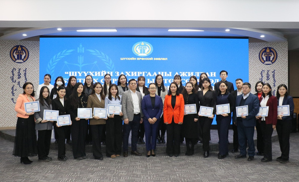 Шүүхийн ерөнхий зөвлөлөөс зохион байгуулсан “Шүүхийн захиргааны ажилтан бэлтгэх” сургалт 2025 оны 11 дүгээр сарын 13-ны өдрөөс 12 дугаар сарын 13-ны өдрийг хүртэл нийт 30 хоногийн хугацаанд танхимын болон дадлага хосолсон хэлбэрээр амжилттай зохион байгуулагдаж, сургалтад хамрагдсан албан хаагчдад өнөөдөр (2026.01.09) гэрчилгээ гардууллаа.