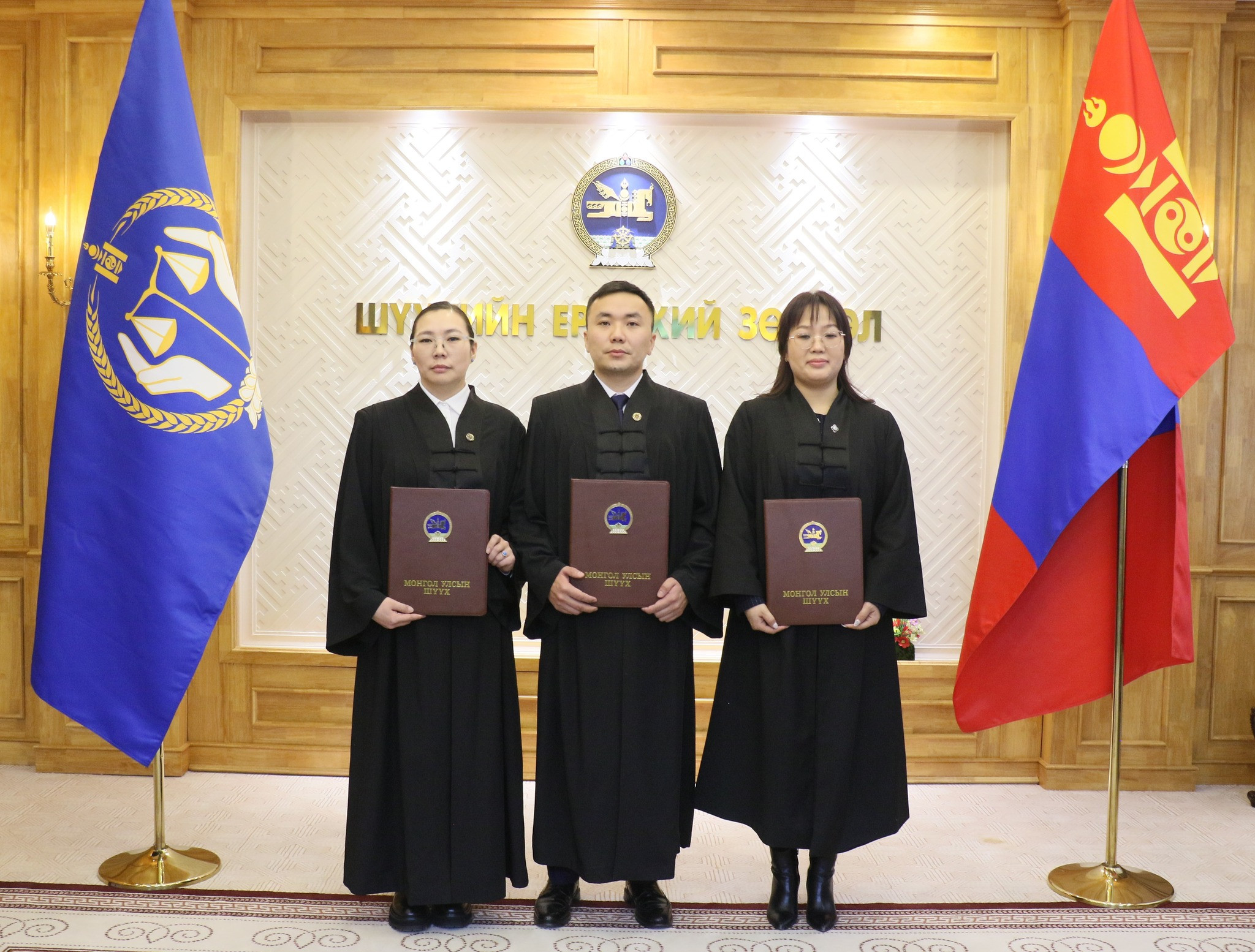 Монгол Улсын Ерөнхийлөгчийн 2025 оны 193 дугаар зарлигаар Нийслэл дэх Гэр бүл, хүүхдийн хэргийн анхан шатны тойргийн шүүхийн шүүгчээр томилогдсон Пүрэвсүрэнгийн Тулга, Баттөмөрийн Болормаа, Ганбаатарын Баттуяа нар Шүүхийн ерөнхий зөвлөлийн байранд 2026 оны 01 дүгээр сарын 05-ны өдөр “Шүүгчийн тангараг” өргөлөө.