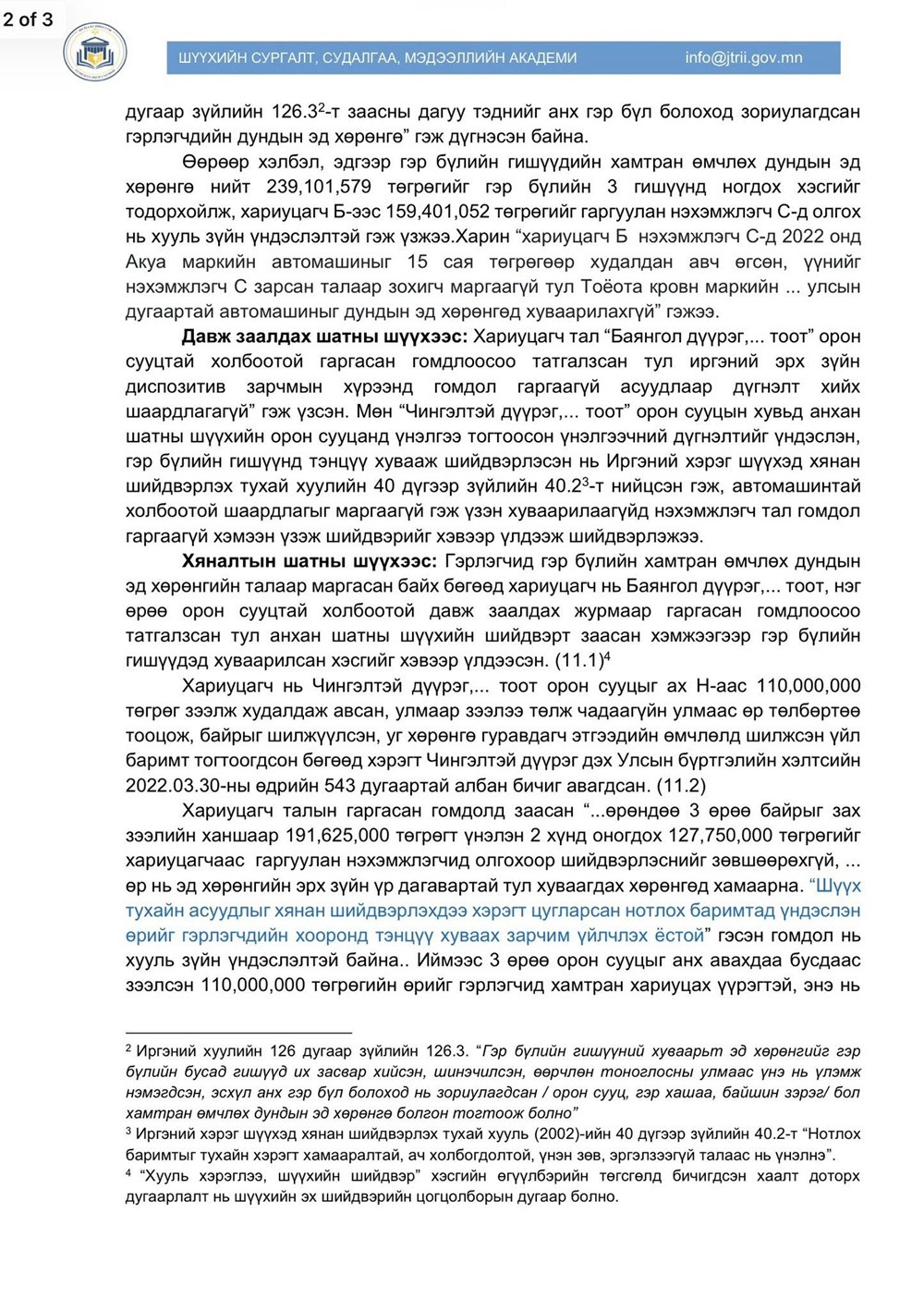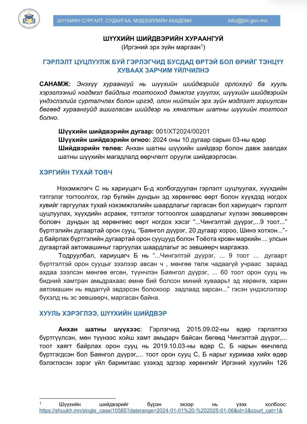 Гэр бүлийн дундын эд хөрөнгөөс оногдох хэсгийг гаргуулахаар шийдвэрлэхдээ тухайн эд хөрөнгийг бий болгохдоо бусдаас авсан зээлийг гэр бүлийн гишүүд хамтран хариуцуулахаар шийдвэрлэжээ.