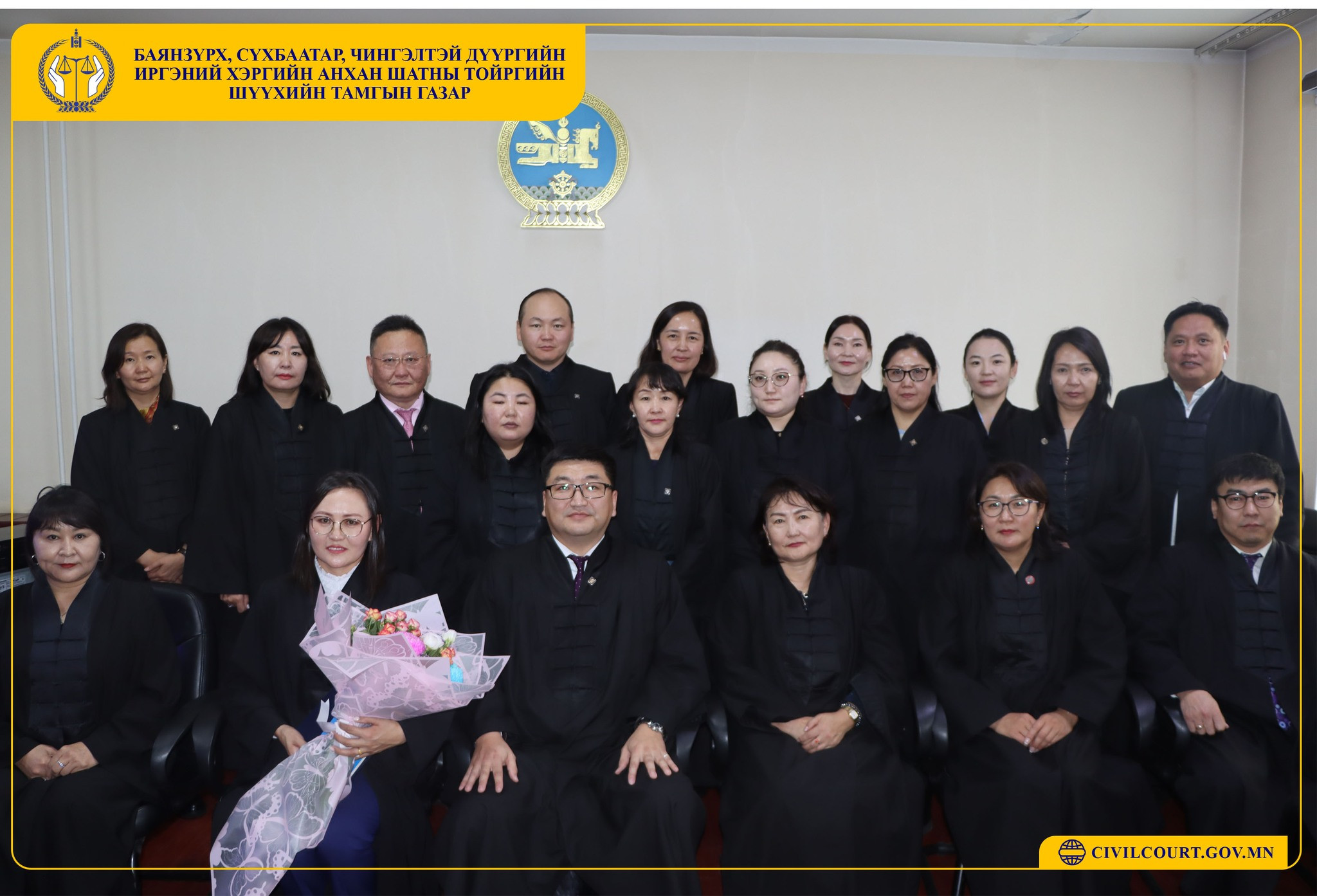 Тангараг өргөсөн шүүгч Л.Болортуяад хамт олны зүгээс баяр хүргэж, цаашдын ажилд нь өндөр амжилт хүсье.