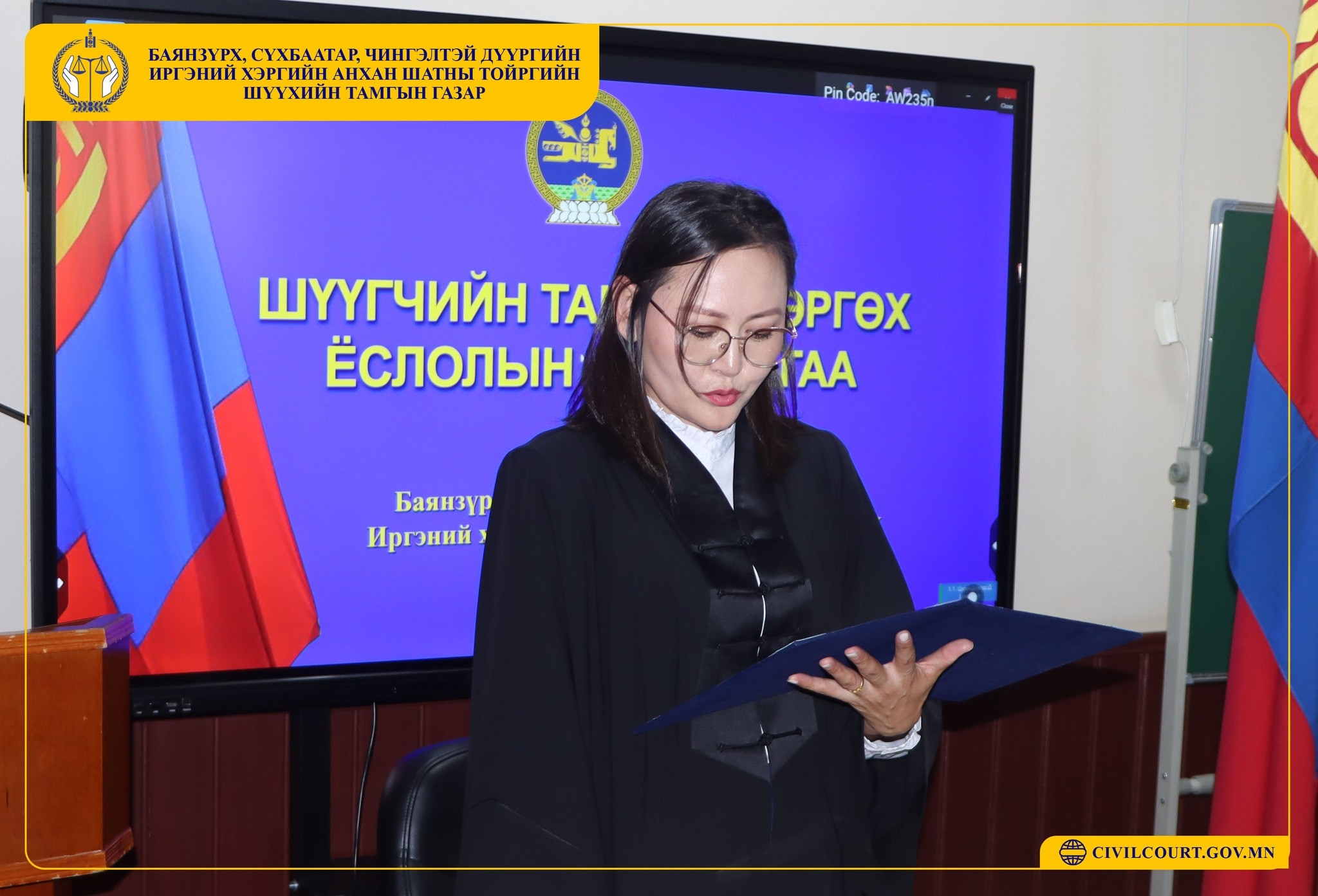 Шүүгчийн тангараг өргөх ёслолын ажиллагааг тус шүүхийн Тамгын газрын дарга Л.Наянтай удирдаж, Монгол Улсын Ерөнхийлөгчийн зарлигийг уншиж сонордуулан шүүгч тангараг өргөснөөр хуульд заасан шүүгчийн бүрэн эрх нь эхэлж байна.
