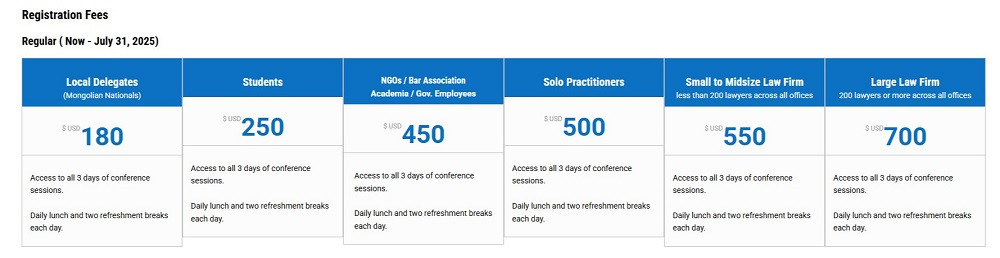 Монголын хуульчид болон оролцогчдыг хөнгөлөлттэй төлбөрөөр бүртгэж байгаа бөгөөд 2025 оны 08 дугаар сарын 15-ны өдрийг хүртэлх хугацаанд 180 ам.доллароор бүртгэх бол 2025 оны 08 дугаар сарын 16-наас 2025 оны 09 дүгээр сарын 15-ны өдөр хүртэл 200 ам.доллароор бүртгэх юм. Бүртгэл 2025 оны 09 дүгээр сарын 15-ны өдөр хаагдах бөгөөд төлбөр төлснөөр бүртгэл баталгаажихыг анхаарна уу.